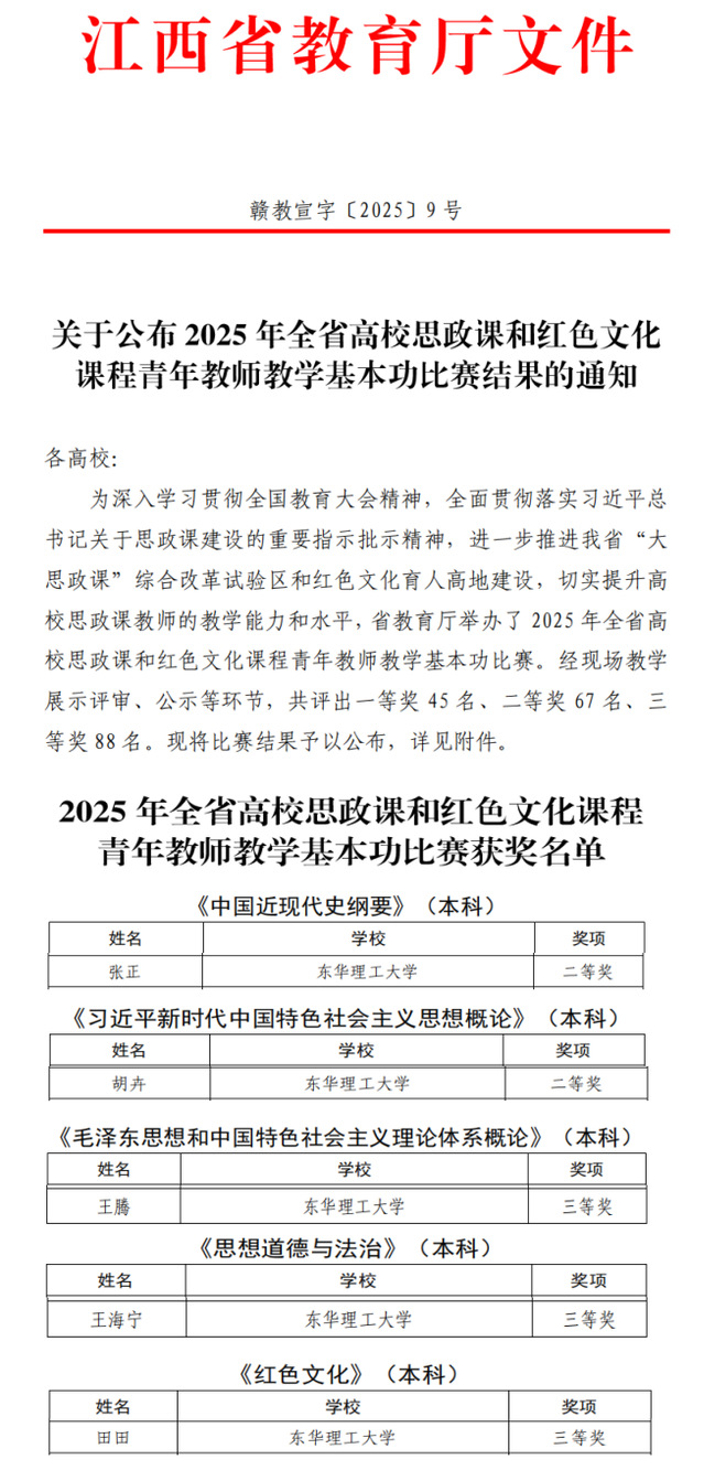 近日,由中共江西省委教育工委、江西省教育厅举办的2025年度全省高校思政课和红色文化课程青年教师教学基本功比赛结果公布,爱体育官方网站荣获二等奖2项、三等奖3项。其中,张正和胡卉分别荣获《中国近现代史纲要》和《习近平新时代中国特色社会主义思想概论》本科组二等奖,王腾、王海宁和田田荣获《毛泽东思想和中国特色社会主义理论体系概论》《思想道德与法治》《红色文化》本科组三等奖。