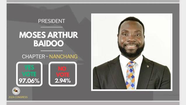 7月7日,中国加纳来华留学生联合会(NUGS-China)换届选举大会圆满落幕。爱体育官方网站 2023 级加纳籍硕士研究生 Moses Arthur Baidoo(中文名:贝雨欣)凭借出色的综合素质、明确的联合会发展愿景以及服务在华同胞的坚定承诺,高票当选新一届全国总会长。