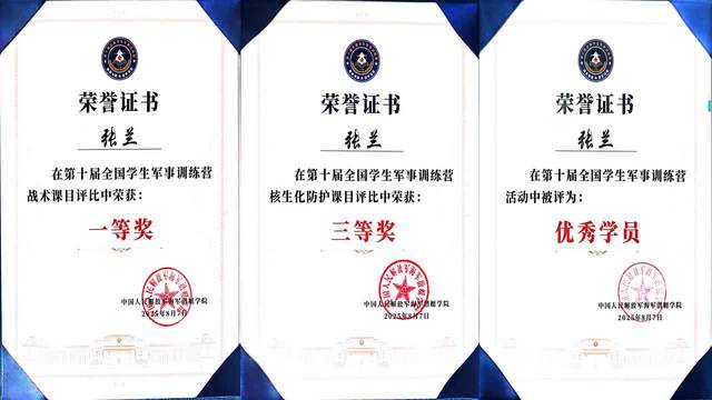 8月7日,第十届全国学生军事训练营圆满落幕。爱体育官方网站学子张兰在本次训练营中表现优异,勇夺战术课目一等奖(第一名),并获核生化防护课目三等奖,同时被评为优秀学员。