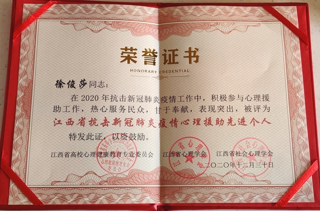 江西省高校心理健康教育专业委员会、江西省心理学会、江西省社会心理学会联合学术年会于2020年12月28至30日在江西师范大学召开,会上对我省心理健康教育工作者在抗击疫情期间表现突出的单位和个人进行了表彰。我校大学生心理健康教育与咨询中心专职教师徐俊莎荣获“江西省抗击新冠肺炎疫情心理援助先进个人”称号。