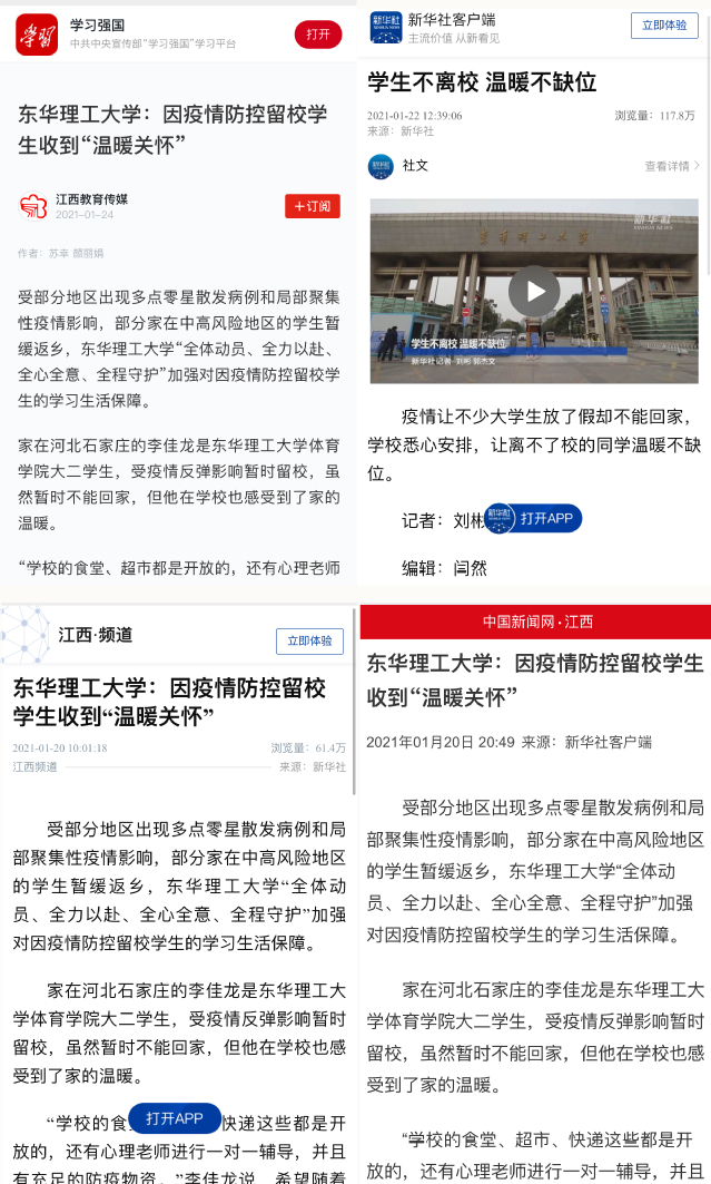 编者按:受部分地区出现多点零星散发病例和局部聚集性疫情影响,部分家在中高风险地区的学生暂缓返乡,我校“全体动员、全力以赴、全心全意、全程守护”加强对因疫情防控留校学生的学习生活保障。学习强国、新华社客户端、中新网、中国教育在线、江西教育电视台等主流媒体对此进行报道,现将报道转载如下: