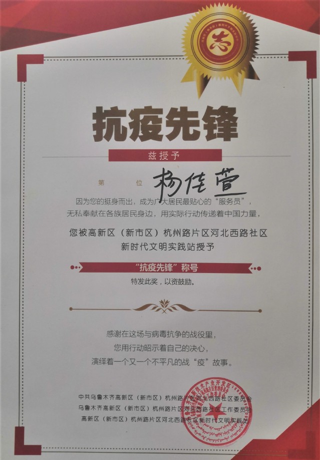 家在新疆乌鲁木齐的杨佳萱,系我校理学院统计专业学生,由于社区封闭管理,为保证小区居民正常生活,杨佳萱主动到社区报到,成了广大居民贴心的“服务员”,无私奉献在各族居民身边,每天为居民购买日常用品、倒垃圾、取快递、量体温。她说:“这种关键时刻作为党员就做好带头作用,利用假期时间为社区做一些力所能及的事,内心有满满地成就感,我做得远远还不够。”杨佳萱用行动昭示着自己的决心,她被社区授予“抗疫先锋”荣誉称号。