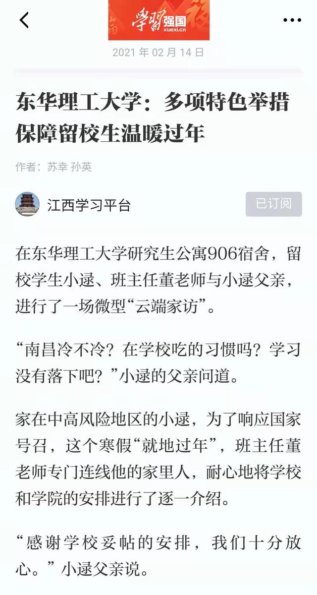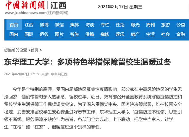 编者按:为深入贯彻党中央、国务院决策部署,维护校园安全稳定,我校妥善安排11名家住中高风险地区的留校学生安心安全过好春节。学校以“疫情防控不松懈、思想引领不断线、服务保障不缺位”为宗旨,各部门全力以赴、上下联动,把学生当家人,让学生“在校”如“在家”,多项特色举措保障留校生温暖过冬。学习强国、中新网、中国教育在线、江西新闻客户端等媒体对此进行报道,现将相关内容转载如下: