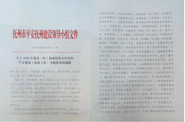 近日,抚州市平安抚州建设领导小组下发了《关于2020年度县(区)和市综治责任单位平安建设(综治工作)考核结果的通报》(抚平安组发〔2021〕1号),学校被评为抚州市“2020年度市直平安建设(综治工作)优秀单位”。这是我校自2013年接受属地抚州市平安建设考评以来,连续八年获此殊荣。