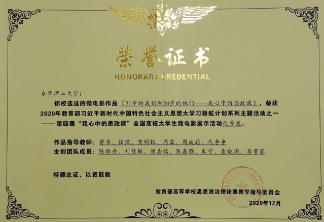 日前,教育部公布了第四届“我心中的思政课”全国高校大学生微电影展示活动获奖名单,我校拍摄选送的微电影《20岁的我们和20岁的他们——我心中的思政课》荣获优秀奖。