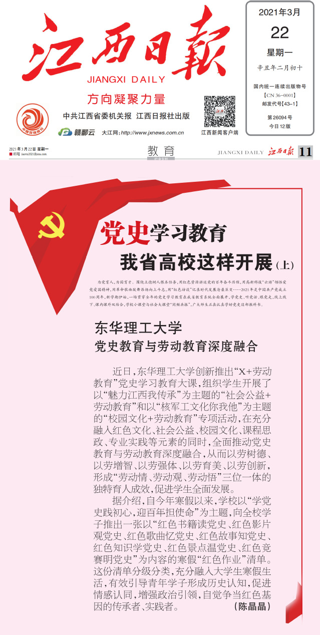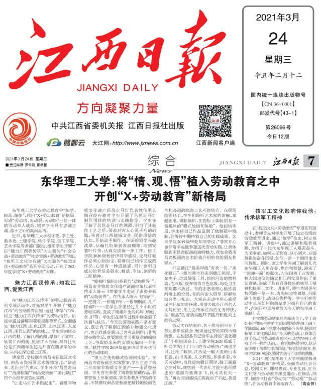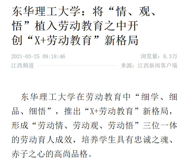 编者按:为深入贯彻落实《中共中央国务院关于全面加强新时代大中小学劳动教育的意见》要求,落实立德树人根本任务,培养德智体美劳全面发展的社会主义建设者和接班人,我校在劳动教育中“细学、细品、细悟”,推出“X+劳动教育”新格局,形成“劳动情、劳动观、劳动悟”三位一体的劳动育人成效,培养学生具有忠诚之魂、赤子之心的高尚品格。新华社客户端、学习强国、江西日报、江西教育、新浪网等媒体对此进行报道,现将相关内容转载如下: