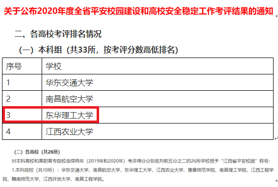近日,省委教育工委、省教育厅发布了《关于公布2020年度全省平安校园建设和高校安全稳定工作考评结果的通知》,通报了2020年全省89所高校(其中,本科院校33所,高职院校56所)安全稳定考评结果。我校在33所本科学校中排名第3位,荣获“江西省平安校园”称号,这是自2019年以来我校连续两次获此殊荣。