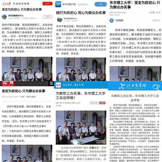 编者按:自党史学习教育开展以来,我校聚焦师生关注的热点、难点问题,在整改落实上下功夫、用心思,提升管理服务能力,解决师生实际困难,办了一批得人心、暖人心、稳人心的实事好事,使师生的获得感、幸福感和安全感有实实在在的提升,切实感受到党史教育带来的新变化、新气象、新成果。人民日报客户端、新华社客户端、新华网客户端、央广网、搜狐网、新浪网、腾讯新闻网、江西教育网、大江网等主流媒体,对我校工会为师生办实事工作案例进行了报道,引起社会广泛关注,现将原文内容转载如下:
