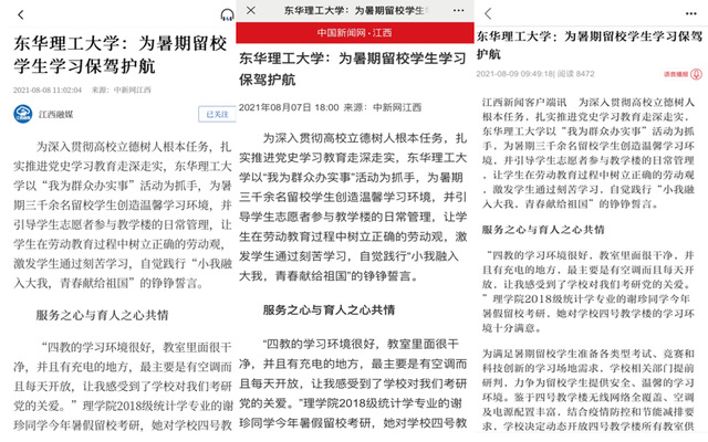 编者按:为深入贯彻高校立德树人根本任务,扎实推进党史学习教育走深走实,爱体育官方网站以“我为群众办实事”活动为抓手,为暑期三千余名留校学生创造温馨学习环境,并引导学生志愿者参与教学楼的日常管理,让学生在劳动教育过程中树立正确的劳动观,激发学生通过刻苦学习,自觉践行“小我融入大我,青春献给祖国”的铮铮誓言。新华社客户端、中国新闻网、江西新闻客户端、江西教育电视台等对此进行报道,现将相关内容转载如下: