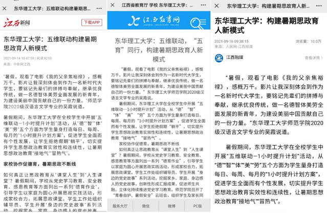 编者按:暑假期间,我校开展“五维联动—1小时提升计划”活动,从“德”“智”“体”“美”“劳”五方面为学生量身打造每日、每周、每月的“1小时提升计划方案”,促进学生全面发展,引导学生拒绝假期“躺平”,切实提升学生思想政治教育实效性和连续性,让暑期思想政治教育“接地气”“冒热气”。人民网、中新网、新华社、江西新闻客户端、江西教育网、凤凰网等对此进行报道,现将相关内容转载如下: