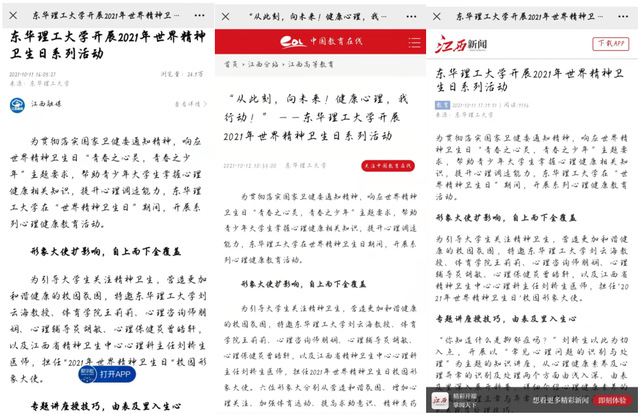 编者按:2021年10月10日,我校开展2021年世界精神卫生日系列活动,通过多种途径、形式、手段的宣传教育,帮助青少年大学生关注精神卫生和心理健康,掌握心理健康相关知识,提升心理调适能力。新华社客户端、中国教育在线、江西新闻客户端、江西教育网、江西文明网、凤凰网等对此进行报道,现将相关内容转载如下: