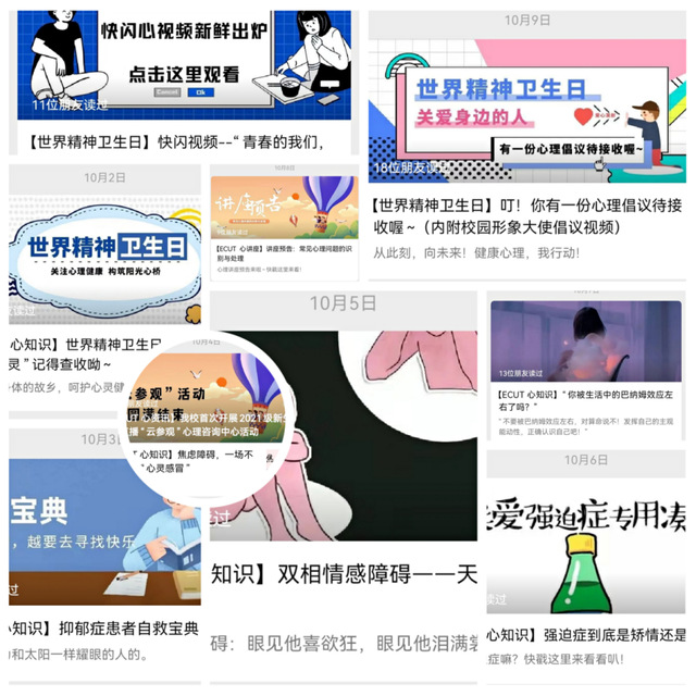 此外,自10月2日起,学校在爱体育官方网站心理中心微信公众号推送世界精神卫生日系列科普及倡议文章10篇,包括世界精神日主题及由来、抑郁症、焦虑症等,浏览量高达12000余人次。学校还发出了可操作性、实用性极强的世界精神卫生日“我行动”倡议十条,极大提高了大学生进行自我心理调适的主动性。