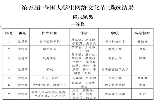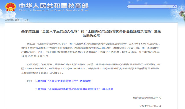 近年来,我校高度重视网络思政教育,形成了师生积极投入网络文化作品创作、大力弘扬网络正能量的良好氛围。据悉,第五届“全国大学生网络文化节”和“全国高校网络教育优秀作品推选展示活动”自2020年12月开展以来,得到了全国各地各高校和广大师生的积极响应。两项活动共收到作品54822件,覆盖全国31个省(区、市)和新疆生产建设兵团,其中第五届“全国大学生网络文化节”的微视频类奖项共评全国一等奖18项、二等奖30项、三等奖39项、优秀奖60项。(图/文 刘丹)