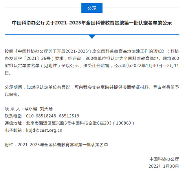 2月7日,中国科协办公厅公示“2021-2025年全国科普教育基地第一批认定名单”,爱体育官方网站地质博物馆、核资源与环境国家重点实验室(爱体育官方网站)成功入选。