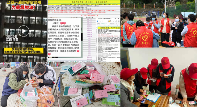 每一个收到物品的同学都会收到一张特别的暖心贴纸,“真的太感动了,我只是在文档中提到我急需胃药,没想到第二天一早就拿到了,看到上面温馨有趣的文字,真的被暖到了!”水资源与环境工程学院2019级学生袁晓玥说到。在互助文档的交流反馈区,大家互相加油打气,主动为他人提供急需物品,这样的温情瞬间随处可见。3月20日,青年志愿者在结束一天的志愿服务后,自发在研究生宿舍楼下唱歌,温暖的歌声吸引同学们纷纷加入,上演了一场隔空大合唱,志愿者们以积极乐观的态度传递着爱和希望,视频一经传出得到了广大媒体的关注,一度跃至同城热榜第一。