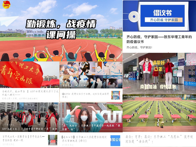 暖心宣传,助力防疫。“不要贴贴,不要贴贴,贴贴危险,还是密接” “不点外卖,病毒进校无门,不带口罩,遍地危机四伏”“预防千万条,口罩第一条”等时下流行防疫宣传标语在校园内随处可见,内容好记又温暖人心。这些条幅标语把疫情防控的基本常识融入其中,时时提醒师生积极配合学校防控要求。校团委以“东华理工青年”和“爱体育官方网站学生会”等新媒体平台为宣传阵地,挖掘和宣传我校在疫情防控阻击战中涌现的先进个人和典型事迹,讲好青春防疫故事,弘扬和发挥我校青年疫情防控网络正能量,不断传递疫情防控“最强音”,让防疫宣传“声”入人心,目前累计共推出疫情防控推文21篇,防疫视频4个。