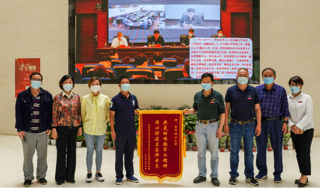 5月24日上午,南昌市红谷滩区沙井街道昌北社区党委书记黄新旭、委员王艳红代表昌北社区为我校送上写有“共克时艰彰军工精神,同心防疫显东华本色”的锦旗和感谢信,感谢我校居住在东华锦城的教职工志愿者和离退休党委党员志愿者为小区防疫工作做出的突出贡献。校党委常委、副校长聂逢君,离退休党委第七党支部书记,东华锦城业主委员会主任及小区志愿者代表参加感谢仪式。