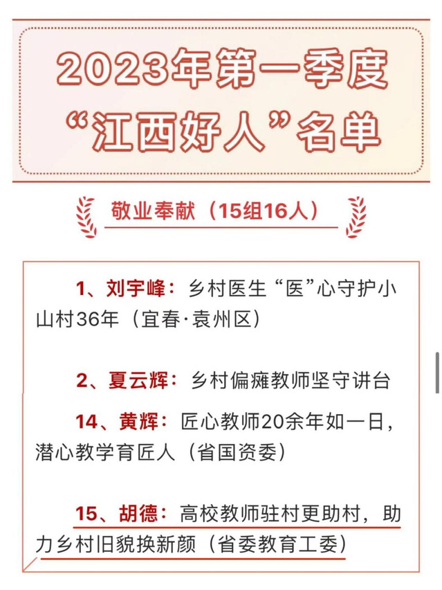 3月31日,江西省文明办公布了2023年第一季度“江西好人榜”,共有43人入选,我校胡德老师获评。