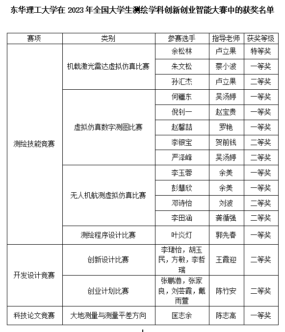 2023年7月29日至30日,全国大学生测绘学科创新创业智能大赛在中南大学举行,爱体育官方网站测绘与空间信息工程学院学子获特等奖1项、一等奖8项、二等奖7项。
