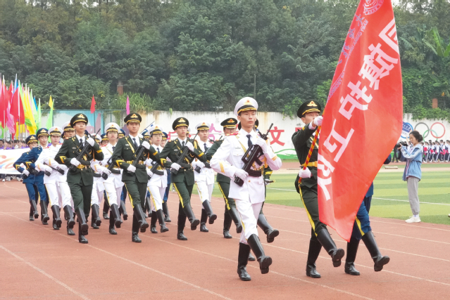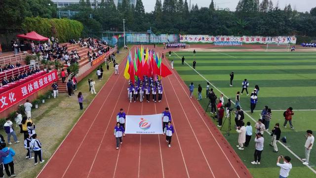 伴着激昂的《运动员进行曲》,仪仗队、彩旗队、裁判员、运动员依次入场,他们热情澎湃,步履铿锵,喊着响亮的口号,迈着坚定的步伐向主席台走来。伴随着庄严肃穆的《义勇军进行曲》,鲜艳的五星红旗缓缓升起,全场师生行注目礼,齐唱国歌。随后,运动员代表、裁判员代表高举右拳,庄严宣誓。
