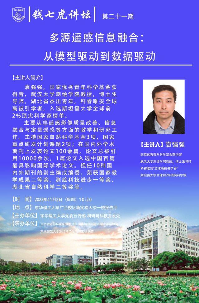 应党委宣传部邀请,国家优秀青年科学基金获得者袁强强教授来到“爱体育官方网站”,以“多源遥感信息融合:从模型驱动到数据驱动”为主题开展讲座。欢迎全校师生届时前往聆听。