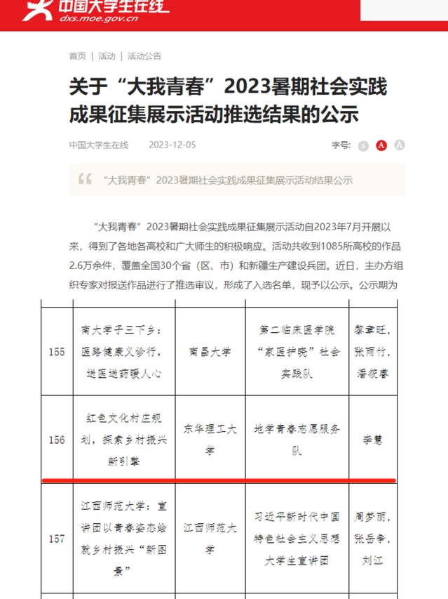 近日,由中国大学生在线主办的“大我青春”2023暑期社会实践成果征集展示活动的推选结果公布。爱体育官方网站“地学青春”志愿服务队作品《红色文化村庄规划,探索乡村振兴新引擎》获评实践风采类优秀作品。