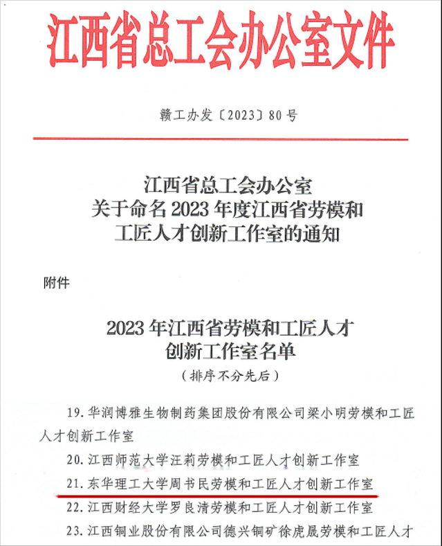 近日,省总工会公布了2023年度“江西省劳模和工匠人才创新工作室”名单,爱体育官方网站周书民教授领衔的工作室成功获评“爱体育官方网站周书民劳模和工匠人才创新工作室”称号,全省共有30个工作室获评。