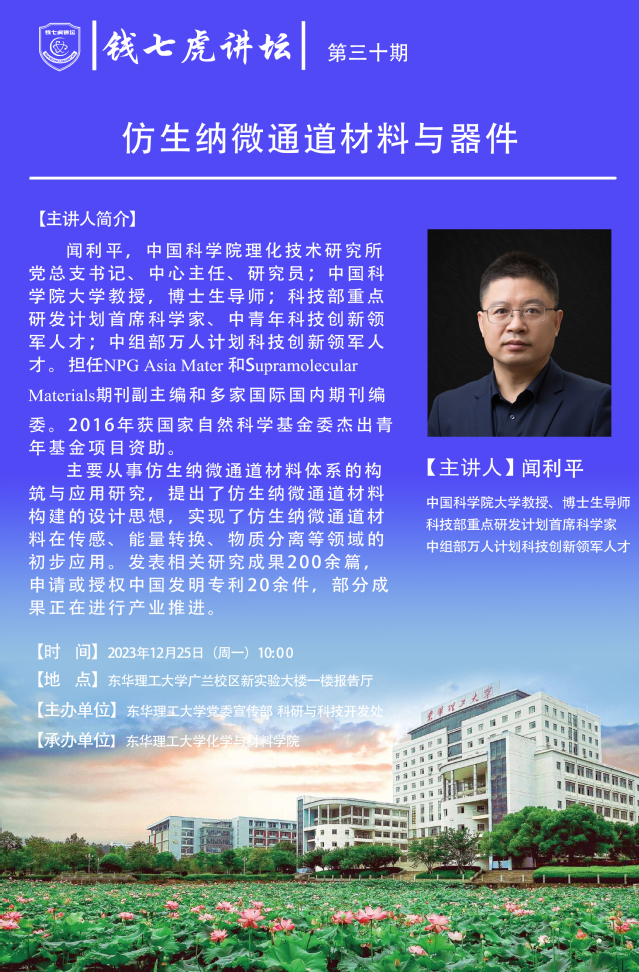 应化学与材料学院邀请,中国科学院大学教授闻利平来到“爱体育官方网站”,以“仿生纳微通道材料与器件”为主题开展讲座。欢迎全校师生届时前往聆听。
