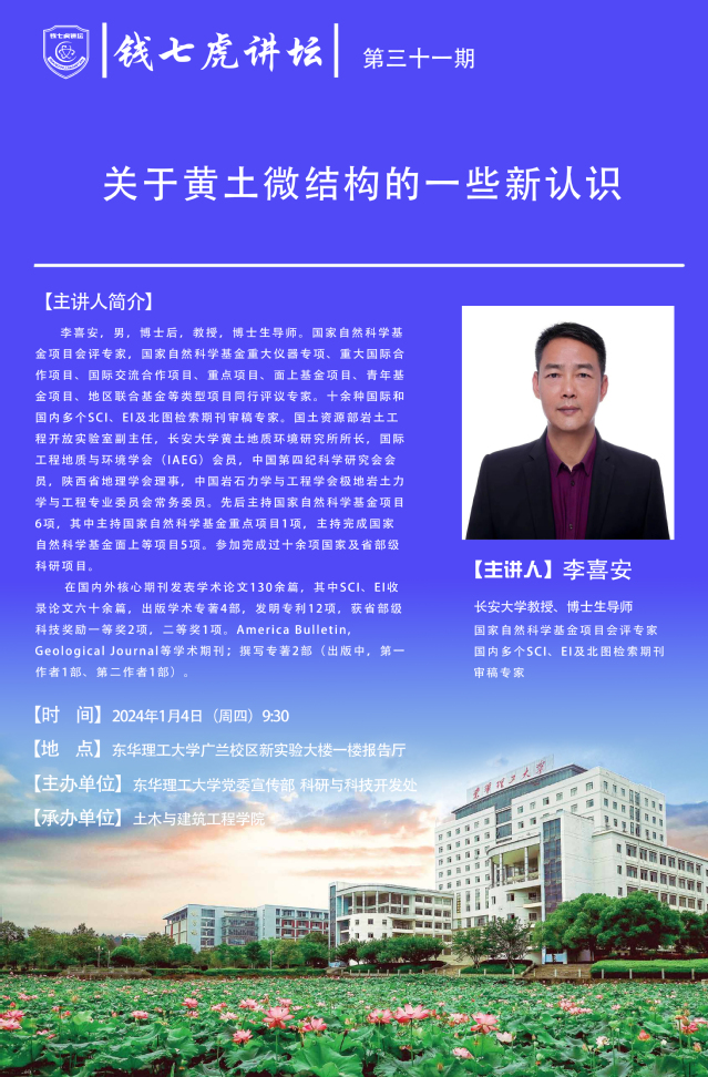 应土木与建筑工程学院邀请,长安大学教授,博士生导师李喜安来到“爱体育官方网站”,以“关于黄土微结构的一些新认识”为主题开展讲座。欢迎全校师生届时前往聆听。