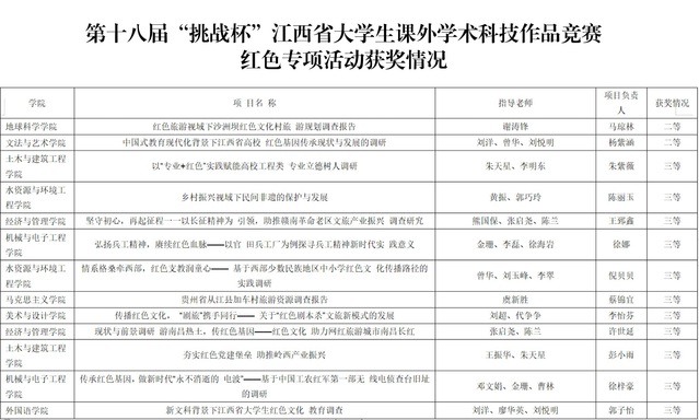 本届挑战杯红色专项赛以“实践感悟新时代 挺膺担当新征程”为主题,旨在引导大学生在学思悟践中传承红色基因,感悟初心使命。作品《红色旅游视域下沙洲坝红色文化村旅游规划调查报告》和《中国式教育现代化背景下江西省高校红色基因传承现状与发展的调研》荣获二等奖;作品《以“专业+红色”实践赋能高校工程类专业立德树人调研》等11项荣获三等奖。