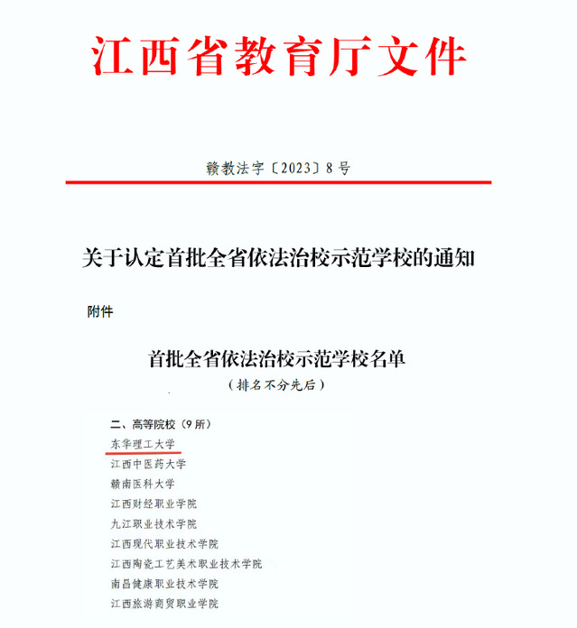 近日,省教育厅印发《关于认定首批全省依法治校示范学校的通知》(赣教法字〔2023〕8号),爱体育官方网站入选“首批全省依法治校示范学校”,全省共9所高校入选。