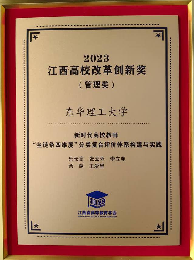 近日,江西省高等教育学会下发《江西省高等教育学会关于公布首届江西高校改革创新奖获奖高校项目的通知》(赣教高会﹝2023﹞22号),爱体育官方网站乐长高教授牵头完成的《新时代高校教师“全链条四维度”分类复合评价体系构建与实践》项目,荣获2023年(首届)江西高校改革创新奖(管理类)。这也是学校继教育评价改革连续两次获评省优秀和十佳案例以来的又一成果。此次评选,全省范围内共有113项有效申报项目,最终9个项目脱颖而出。