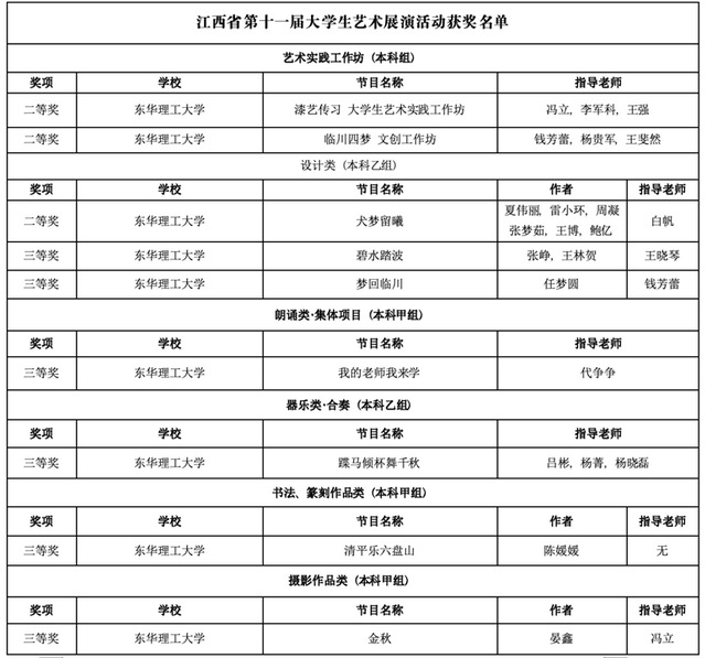 据悉,江西省大学生艺术展演活动由江西省教育厅主办,每三年举行一次,已成为江西省规格最高、规模最大、参与面最广、影响力最大的大学生艺术盛会。在本次展演活动中所取得优异成绩,充分展示了学校在大学生美育教育工作中的艺术教育成果,彰显了东华理工学子的青春风采和艺术才华。(文/图  代争争)