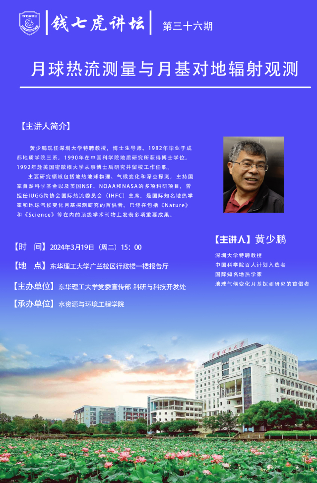 应水资源与环境工程学院邀请,深圳大学特聘教授,国际知名地热学家,地球气候变化月基探测研究的首倡者黄少鹏来到“爱体育官方网站”,以“月球热流测量与月基对地辐射观测”为主题开展讲座。欢迎全校师生届时前往聆听。