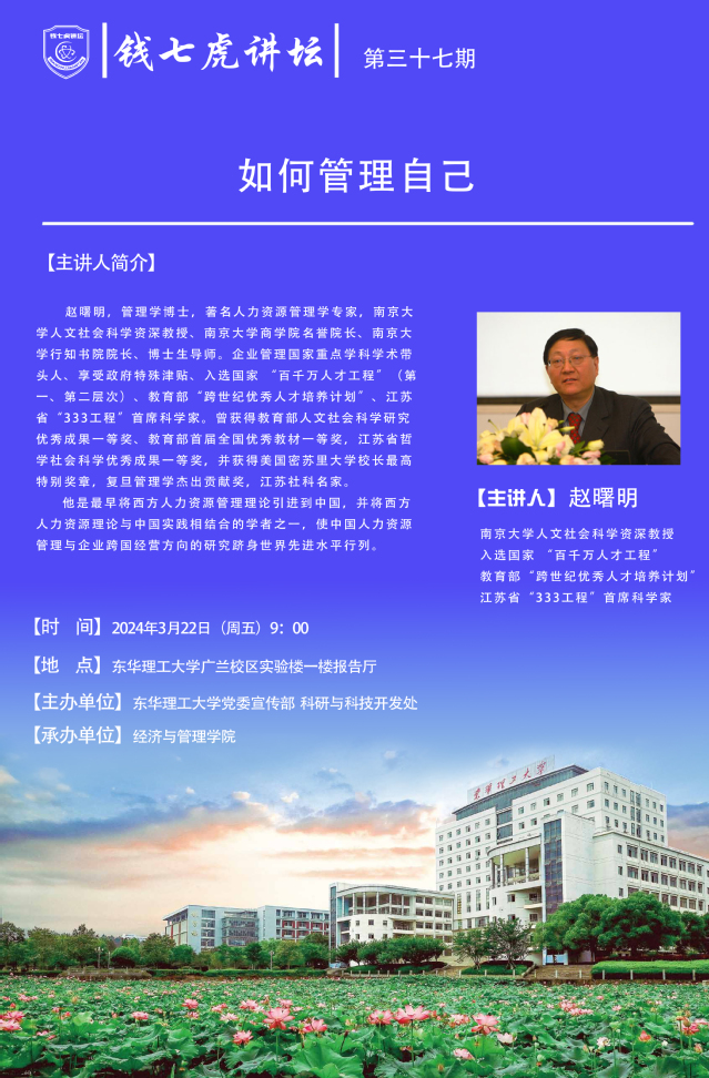 应经济与管理学院邀请,南京大学人文社会科学资深教授,国家“百千万人才工程”,教育部“跨世纪优秀人才培养计划,江苏省“333工程”首席科学家赵曙明来到“爱体育官方网站”,以“如何管理自己”为主题开展讲座。欢迎全校师生届时前往聆听。