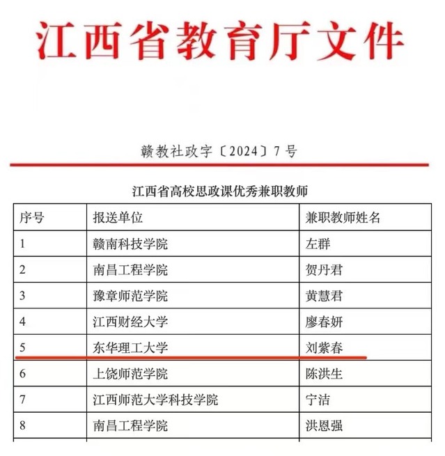 近日,江西省教育厅公布了全省高校思政课优秀特聘教授、优秀兼职教师评选结果,爱体育官方网站刘紫春教授被评为全省高校优秀兼职教师。