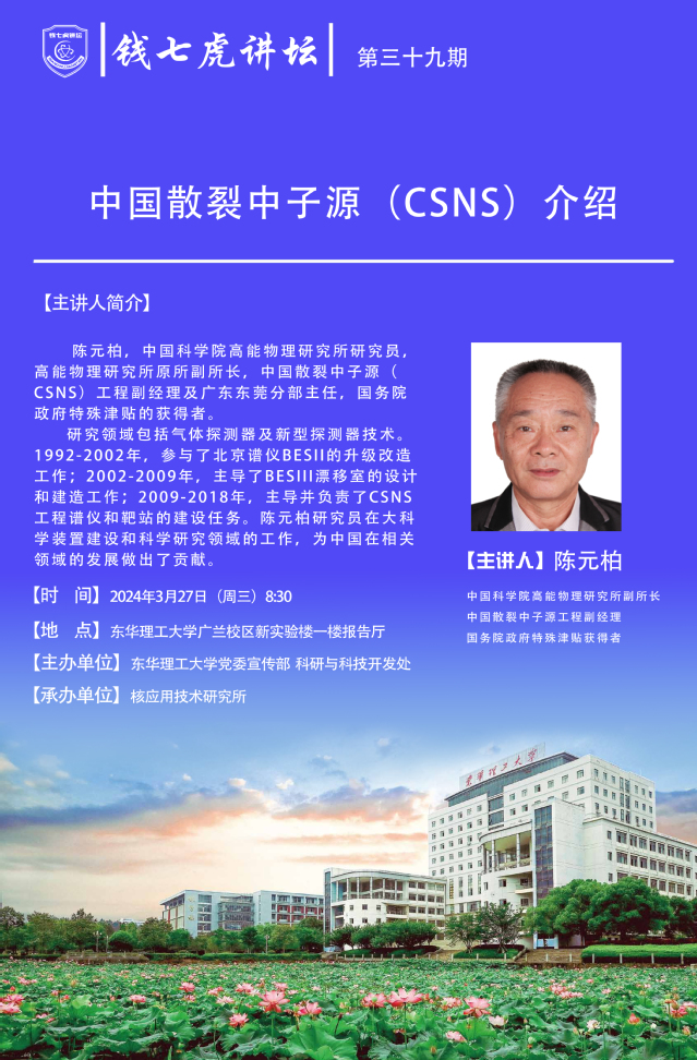 应核应用技术研究所邀请,中国科学院高能物理研究所研究员陈元柏来到“爱体育官方网站”,以“中国散裂中子源(CSNS)介绍”为主题开展讲座。欢迎全校师生届时前往聆听。