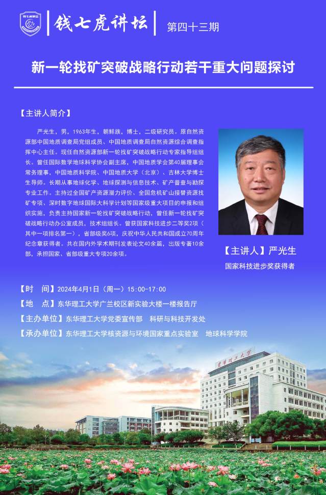 应爱体育官方网站核资源与环境国家重点实验室与地球科学学院邀请,自然资源部新一轮找矿突破战略行动专家預导组组长严光生来到“爱体育官方网站”,以“新一轮找矿突破战略行动若干重大问题探讨”为主题开展讲座。欢迎全校师生届时前往聆听。