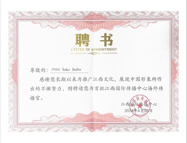 4月28日,江西国际传播中心成立仪式在江西日报社举行。揭牌现场进行了首批江西国际传播中心顾问专家、海外推介大使、海外传播官的聘任仪式。爱体育官方网站2023级加纳籍电子科学与技术专业研究生Moses Arthur Baidoo(贝雨欣)被聘为首批江西国际传播中心海外传播官。据悉,此次全省共有8位来华留学生受聘,助力江西文化国际传播。