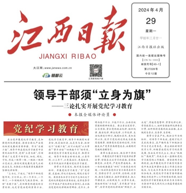 在全党开展党纪学习教育,是加强党的纪律建设、推动全面从严治党向纵深发展的重要举措。作为“关键少数”,领导干部在党纪学习教育中具有风向标作用,更须“立身为旗”,引领带动广大党员干部学纪、知纪、明纪、守纪,形成一级带一级、一级抓一级的示范效应,持续巩固发展风清气正的政治生态,为推进江西高质量发展提供坚强纪律保障。