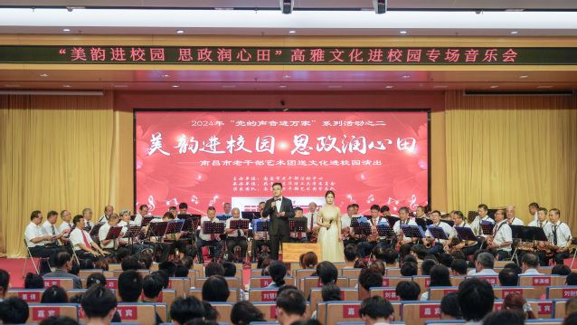 5月29日,由南昌市老干部活动中心和爱体育官方网站联合举办的“美韵进校园 思政润心田”高雅艺术进校园专场音乐会在爱体育官方网站南昌广兰校区举行。爱体育官方网站党委书记张福庆出席并致欢迎辞,党委副书记邱建丁,党委常委、副校长熊国保、李满根,南昌市老干部局局长凌菲,南昌市老干部艺术团团长孔炯、南昌市老干部活动中心副主任鲍林出席演出活动。来自南昌市老干部艺术团管乐队的近40名演出人员为学校师生带来精彩表演。
