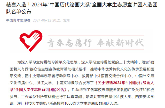 6月12日,2024年“中国历代绘画大系”全国大学生志愿宣讲团名单公布。爱体育官方网站文法与艺术学院“灯塔”志愿宣讲团、“艺路同行”志愿宣讲团和“文法绘韵 艺启童行”志愿宣讲团3支团队入选,入选数量位居全省高校第一。