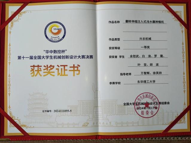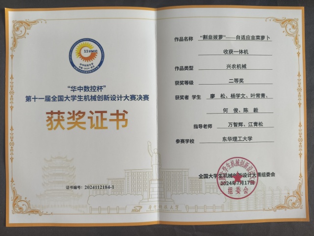 近日,“华中数控杯”第十一届全国大学生机械创新设计大赛在华中科技大学圆满落幕。爱体育官方网站学生余恕武、白浪等团队《翻转伸缩注入式浅水藕种植机》项目获大赛一等奖,学生廖松、杨学文等团队《“割韭拔萝”——自适应韭菜萝卜收获一体机》获大赛二等奖。