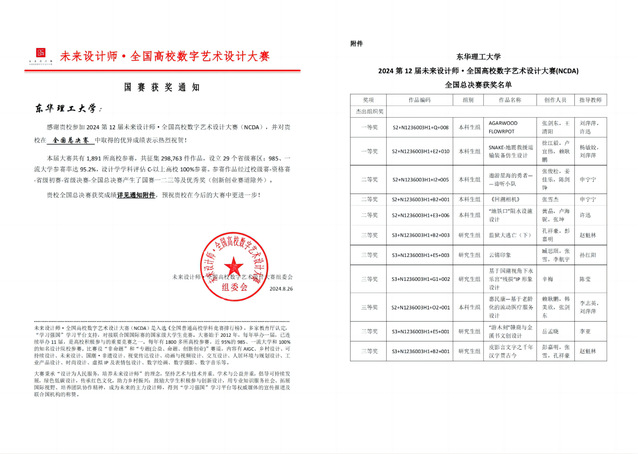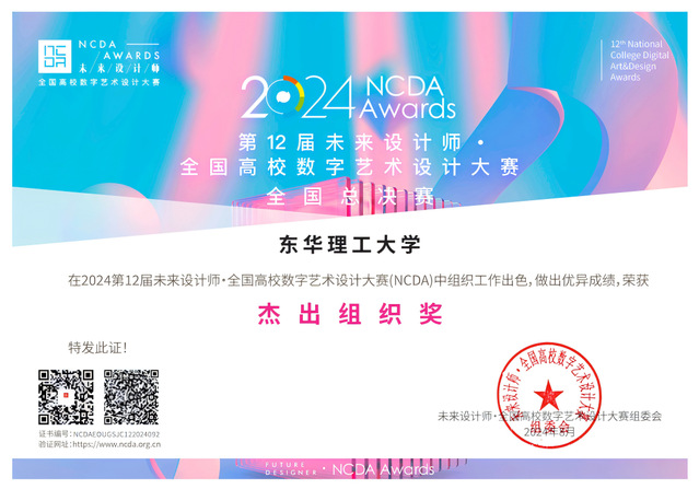 近日,爱体育官方网站美术与设计学院学生在第十二届未来设计师·全国高校数字艺术设计大赛(NCDA)全国总决赛中获一等奖2项、二等奖3项、三等奖6项,学校获评全国杰出组织奖;在江西省赛区评比中,获一等奖18项、二等奖18项、三等奖25项,学校获评江西省赛区优秀组织奖。学校在此次大赛中获奖数达72项,是参加该项赛事取得的历史最好成绩。