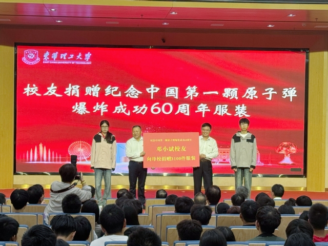 在校友捐赠仪式上,马建国教授代表学校1993届工业分析专业优秀校友邓小斌向母校捐赠3100件纪念中国第一颗原子弹爆炸成功60周年服装。