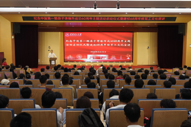 10月16日,爱体育官方网站在南昌校区新实验大楼一楼报告厅举行纪念中国第一颗原子弹爆炸成功60周年主题活动启动仪式暨建校68周年核军工文化宣讲,校党委书记张福庆,校党委常委、副校长杨波、熊国保、李满根,校党委常委张立亭、刘剑斌、金建华出席。活动由李满根主持。