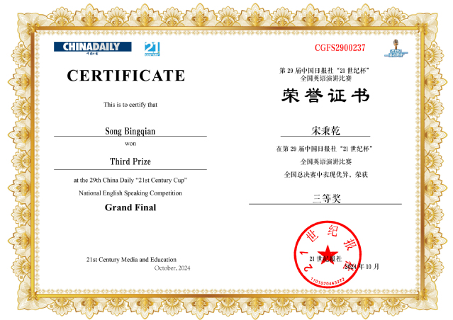 据悉,“21世纪杯”全国英语演讲比赛由中国日报社在1996年创办,入选《2023全国普通高校大学生竞赛分析报告》竞赛目录,是教育部官方认可的全国赛事之一。本届大赛以“The revival of traditional culture”(传统文化的复兴)为演讲主题,设置已备演讲、即席演讲和现场问答三个环节。来自清华大学、浙江大学等全国各大高校的200余名选手参加总决赛。(文/宋秉乾 陈彩芬 图/李雪)