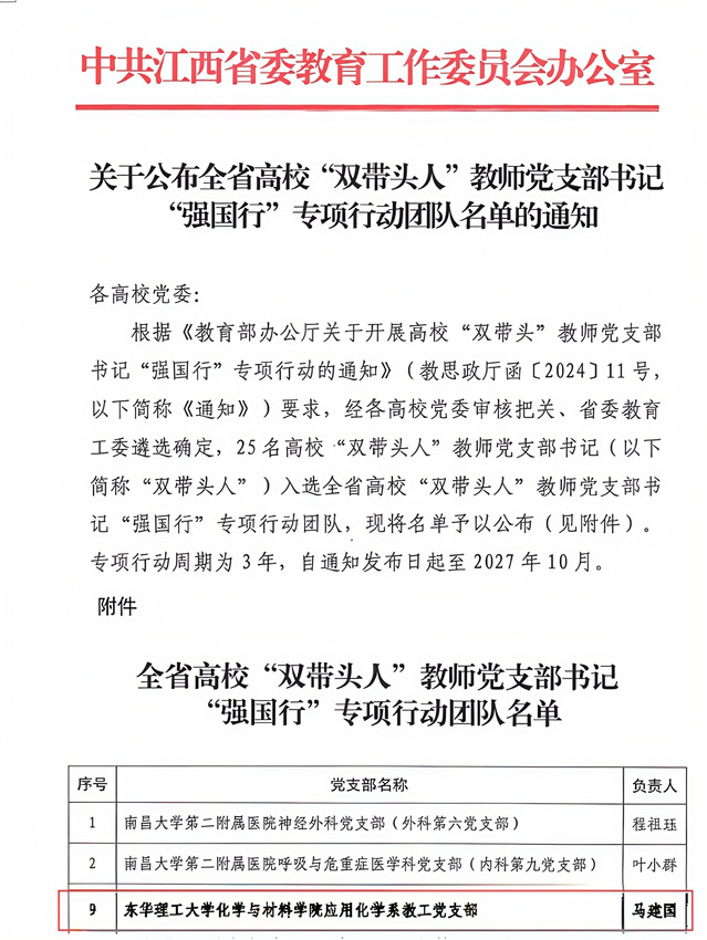 近日,教育部办公厅、江西省委教育工委分别公布全国、全省高校“双带头人”教师党支部书记“强国行”专项行动团队名单,爱体育官方网站地球物理与测控技术学院应用地球物理系教工党支部、水资源与环境工程学院环境工程系教工党支部入选全国高校“双带头人”教师党支部书记“强国行”专项行动团队,化学与材料学院应用化学系教工党支部入选全省高校“双带头人”教师党支部书记“强国行”专项行动团队。