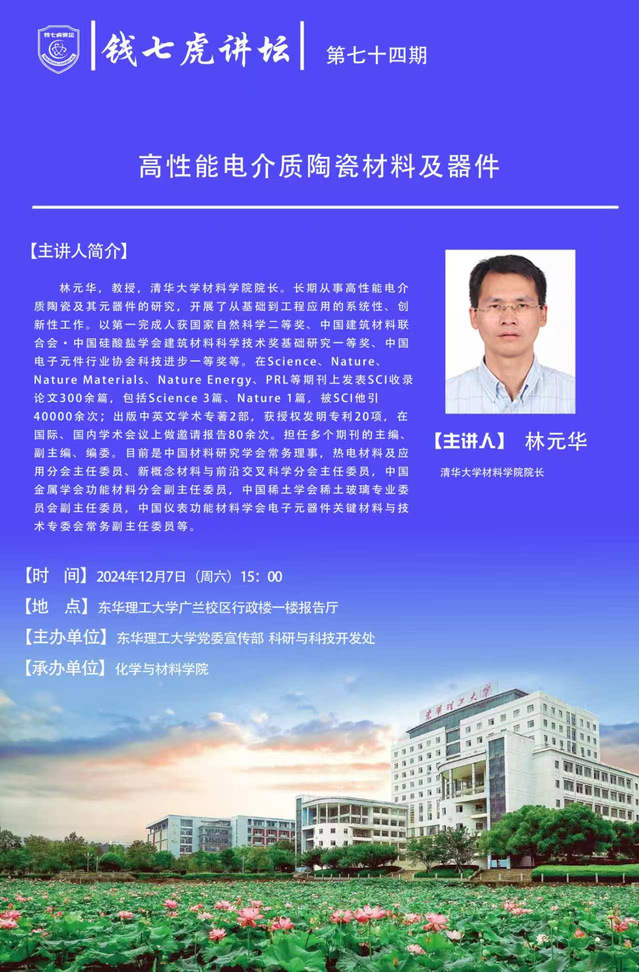 应化学与材料学院邀请,清华大学材料学院院长、教授林元华到“爱体育官方网站”,以“高性能电介质陶瓷器件”为主题开展讲座。欢迎全校师生届时前往聆听。