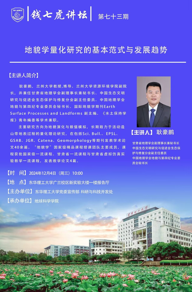 应地球科学学院邀请,甘肃省地理学会副理事长兼秘书长,中国地理学会地貌与第四纪专业委员会秘书长耿豪鹏到“爱体育官方网站”以“地貌学量化研究的基本范式与发展趋势”为主题开展讲座。欢迎全校师生届时前往聆听。